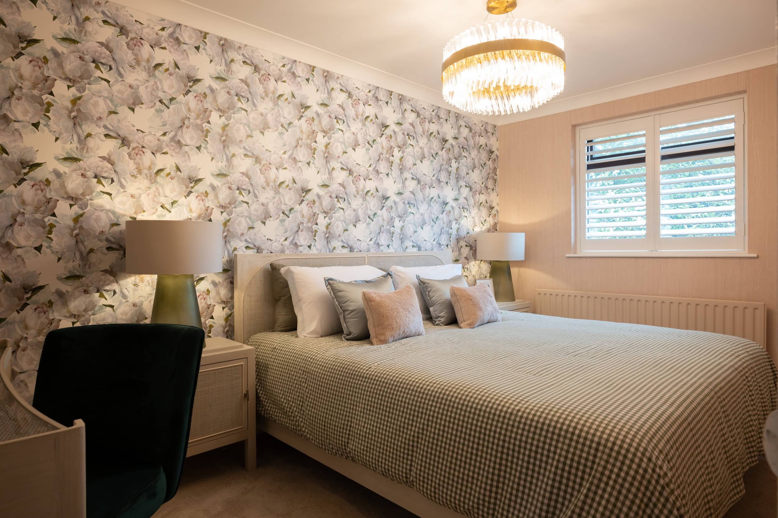 We complemented this using furnishings including a lush green velvet sofa and footstool, tall brushed brass lamp with a bespoke lampshade and a ceramic dining table. We installed window shutters throughout her home so that our client could adjust the amount of natural light throughout the day and not feel overlooked.