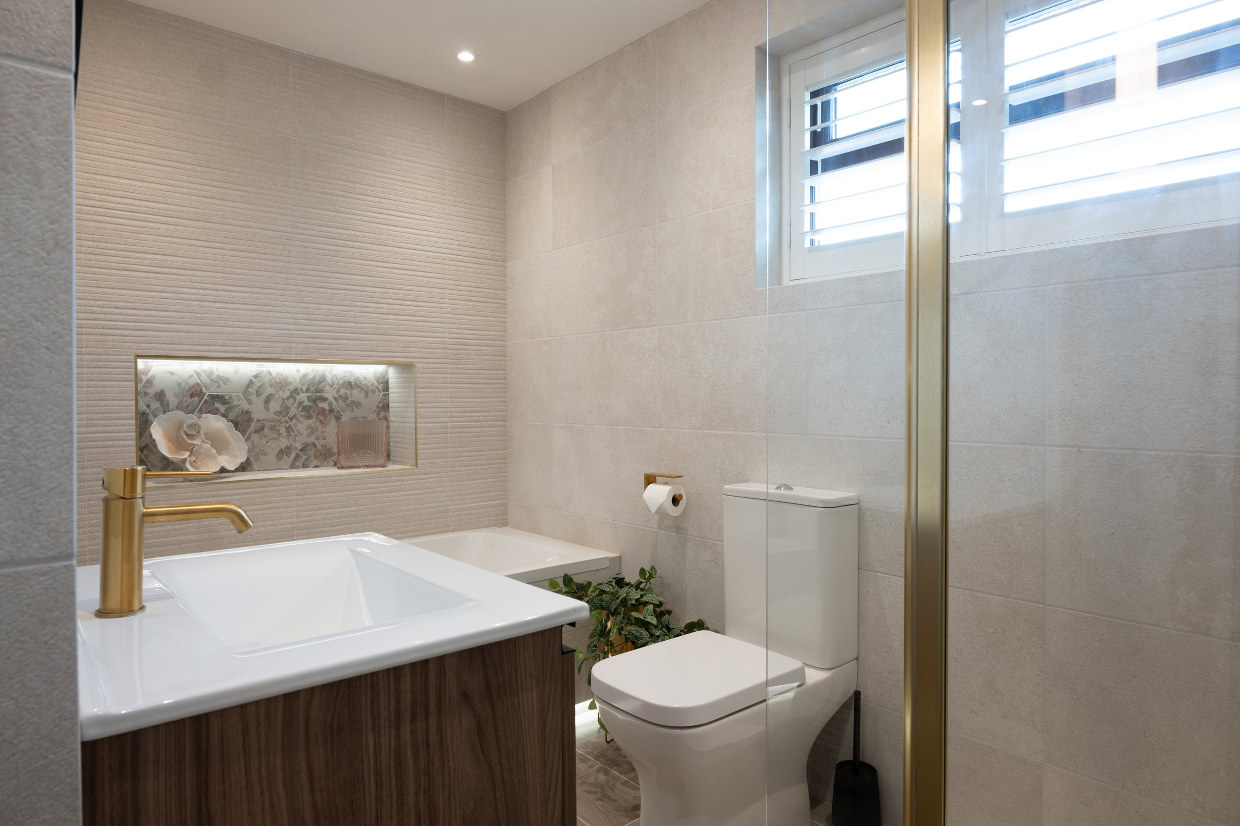 The bathroom was sourced from a local bathroom company, Porcelanosa, and included a large shower featuring elegant gold hardware and dark natural wood accents, with hexagon shaped tiles by Craven Dunnill in the shower that were inspired by nature.